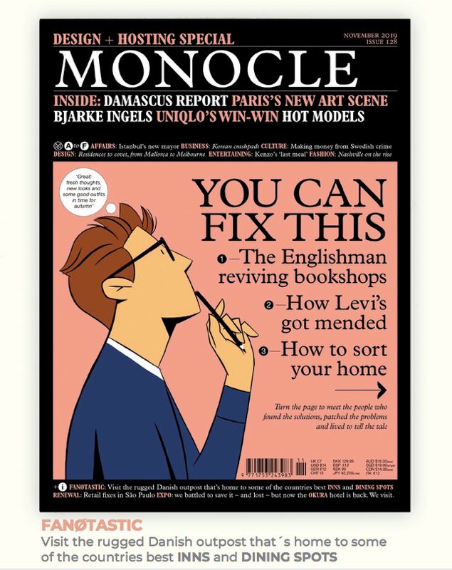 I en overskrift på forsiden af november udgaven af MONOCLE står der »FANØTASTIC – Visit the rugged Danish outpost that’s home to some of the countries best INNS and DINING SPOTS« og inde i bladet er der en fem-sidet feature-artikel om Fanø.