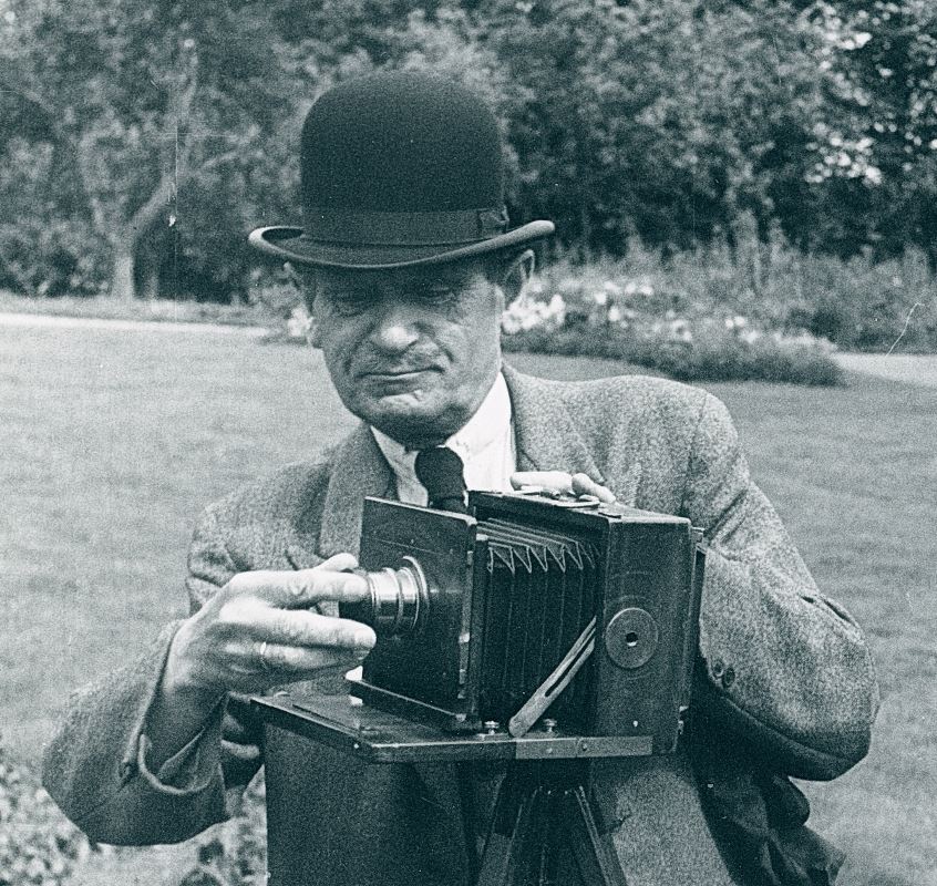 Hugo Matthiessen med sin uundværlige bowlerhat og sit smukke mahognikamera, hvortil der skulle benyttes fotografiske glasplader, der målte 12 x 16,5 cm. Her er han fotograferet i 1949 af kollegaen Harald Langberg.