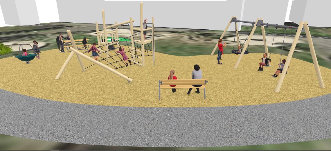 Vi har fået et tilbud fra Kompan (et legeplads-firma), som I kan se på billederne herunder. Den eksisterende gynge, legehuset og guitaren bliver bevaret. Vi håber området igen kan blive et attraktivt sted at opholde sig.
