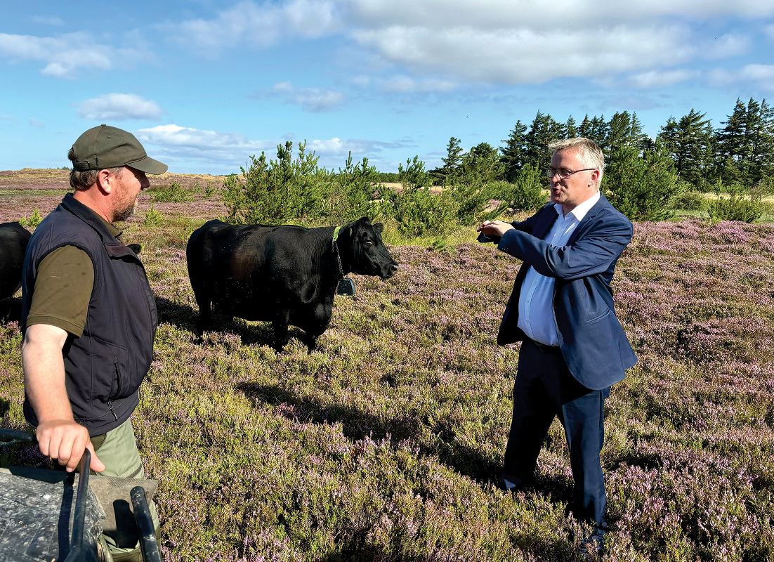 På billedet ses Michael Baun (t.v.) og minister Jacob Jensen på marken med det virtuelle hegn lige mellem dem og kvæget. Foto: John Frikke.
